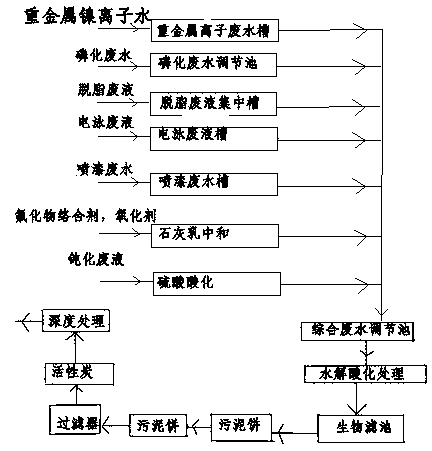 1、重金屬鎳離子水的處理,從出水管收集重金屬離子廢水至重金屬離子廢水池,加入金屬離子捕集劑;