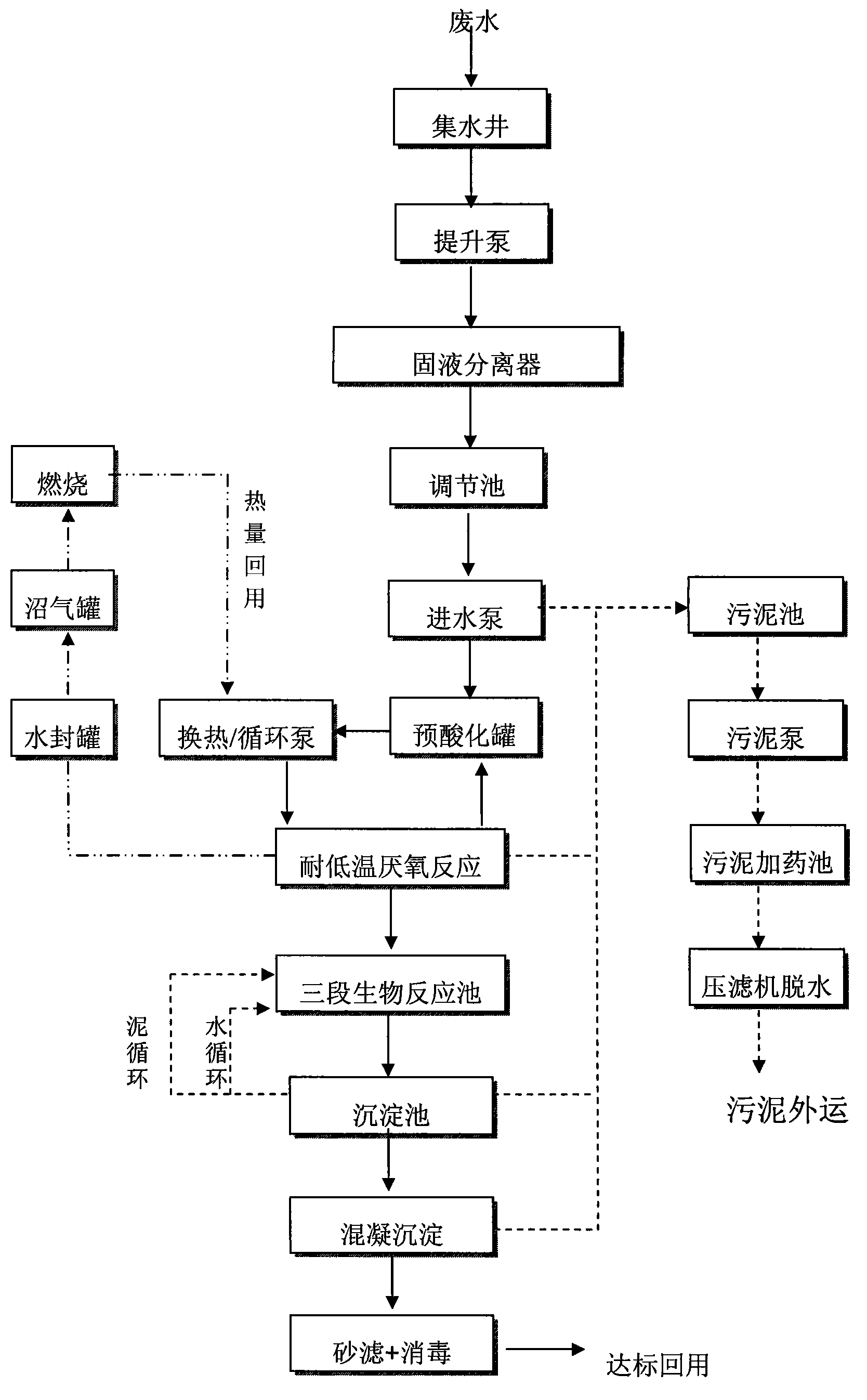 將預(yù)酸化處理后的廢水送入?yún)捬醴磻?yīng)器,在反應(yīng)器啟動(dòng)前加入含有耐低溫微生物菌種的厭氧顆粒污泥,加入量為反應(yīng)器有效體積的1 / 5 ~ 1 / 2,反應(yīng)溫度為14℃~ 20℃,厭氧反應(yīng)產(chǎn)生的沼氣經(jīng)氣水分離、脫硫、脫水后作為能量回收;