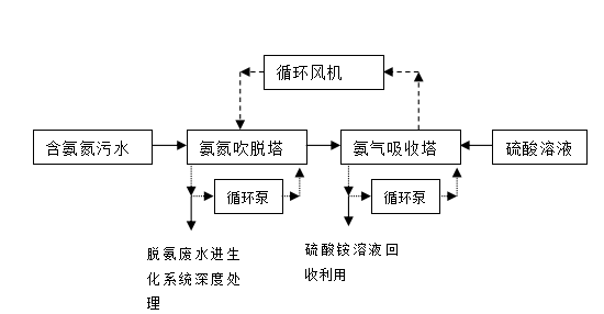 吹脫塔的構(gòu)造采用氣液接觸裝置,在塔的內(nèi)部填充填料,用以提高接觸面積。調(diào)節(jié)pH值后的水從塔的上部淋灑到填料上而形成水滴,順著填料的間隙次***落下,與由風(fēng)機(jī)從塔底向上吹送的空氣逆流接觸,完成傳質(zhì)過(guò)程,使氨由液相轉(zhuǎn)為氣相,隨空氣排放,完成吹脫過(guò)程,脫除率達(dá)75%以上。低濃度廢水通常在常溫下用空氣吹脫,而高濃度廢水則常在加溫狀態(tài)下進(jìn)行吹脫。